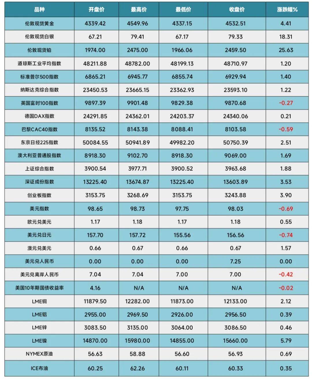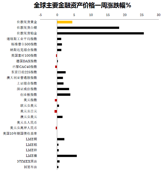 上周国际金价开盘报于4339.42美元/盎司,周中最高触及4549.96美元/盎司,最低价为4337.15美元/盎司,国际金价最终报收于4532.51美元/盎司。整个交易周内国际金价上涨了4.41%,创下了10月中旬给以来的单周最大涨幅。上周海外市场因圣诞假期休市而交投相对清淡,但国际金价依然取得了较大的涨幅。从分时段表现来看,亚洲时段的黄金价格走势明显强于海外。就驱动因素而言,国内铂金和钯金期货大幅走高,带动市场风险偏好回升,资金持续流入包括黄金白银在内的贵金属板块,是推动国际金价上涨的主要原因之一。