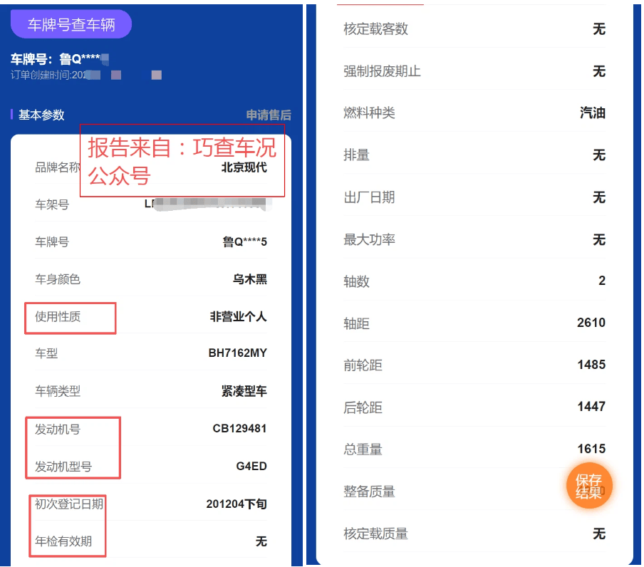 4. 查询结果会清晰展示车辆品牌、车架号、发动机号、注册日期、使用性质等关键信息,可直接截图留存核对。