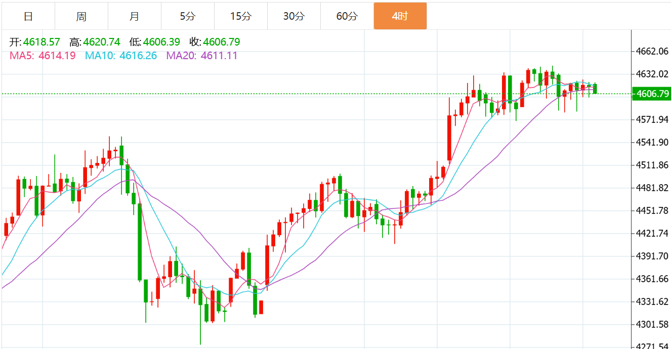 黄金技术面分析:黄金在经历不断冲高走调整之后阶段性我们也是看好区间反复震荡,只是目前处于历史高位,市场情绪也会非常谨慎,所以走势上经常会有拉出新高后调整的走势,昨日黄金市场早盘小幅低开于4631一线,开盘后行情先行回落,日线最低下探至4581位置后企稳反弹,随后多头发力强势拉升至4624,最终收于4615,日线录得一根长下影线的到纺锤阴线收线,多头力量尽显。