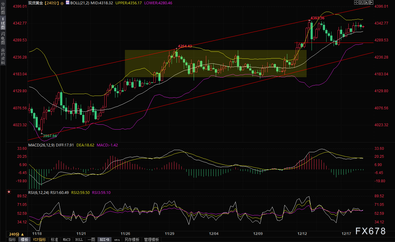 周三(12月18日)亚洲时段,现货黄金在近两个月高点附近窄幅震荡,目前交投于约4325-4343美元区域,整体交投空间明显收窄。一方面,部分多头在高位进行获利了结的操作,同时美国美元指数出现一定程度的反弹,为黄金带来一定压力。但另一方面,黄金作为传统避险资产的属性依然强劲,整体下行空间预计较为有限。