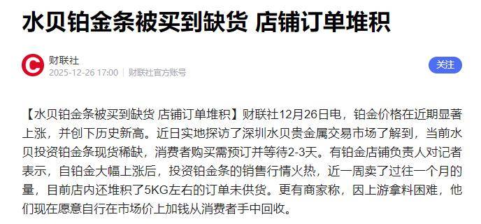 最近,如果走进深圳水贝的铂金交易柜台,大概率会听到这样的对话:“单是开了,但货得等等。” 一位批发商感慨:“今天光是没货可交的订单,估计就有5公斤。放在以前,金条都是有多少拿多少,现在完全反过来了。”