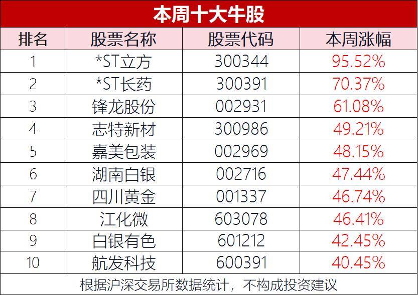 根据交易所数据,本周(1月19日-1月23日)十大牛股如下:*ST立方、*ST长药、锋龙股份、志特新材、嘉美包装、湖南白银、四川黄金、江化微、白银有色、航发科技。
