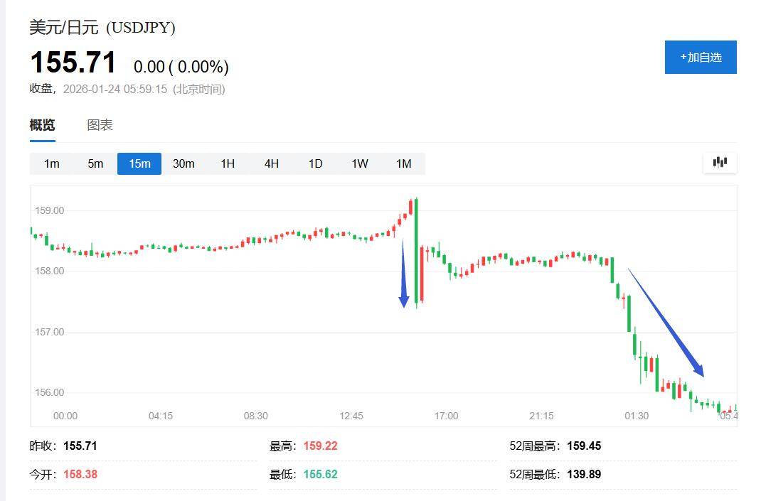 日元的第一波上涨出现在欧市早盘,美元兑日元此前在欧市盘初涨至159.23,自1月14日以来首次盘中涨破159.00,随后跳水转跌,约十分钟左右迅速跌破157.50、日内跌近0.6%,此后保持跌势。美股午盘时段,日元迎来第二波更为猛烈的拉升,抹平去年圣诞节以来跌幅,美元兑日元加速下跌至155.63,刷新去年12月24日以来低位。