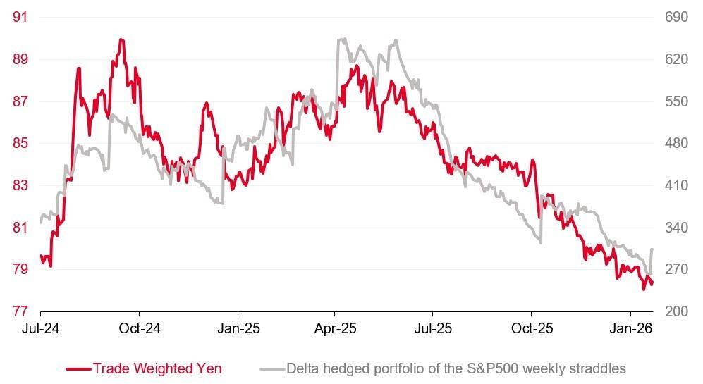 下图灰线代表买入标普500指数极短期波动率的回报,自2025年6月以来,这部分波动率的表现明显逊色。从这个角度看,若这种相关性持续,日元贸易加权汇率走强或许会成为引发更广泛股市避险情绪的重要催化剂。