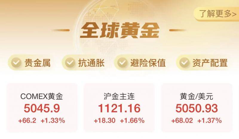 1月26日,国际金价继续上涨。截至北京青年报发稿时,COMEX黄金涨1.33%,报5045.9美元/盎司;现货黄金涨1.36%,报5050.93美元/盎司。美国东部时间1月25日傍晚,COMEX黄金期货价格在电子盘交易中突破每盎司5000美元的历史性关口。