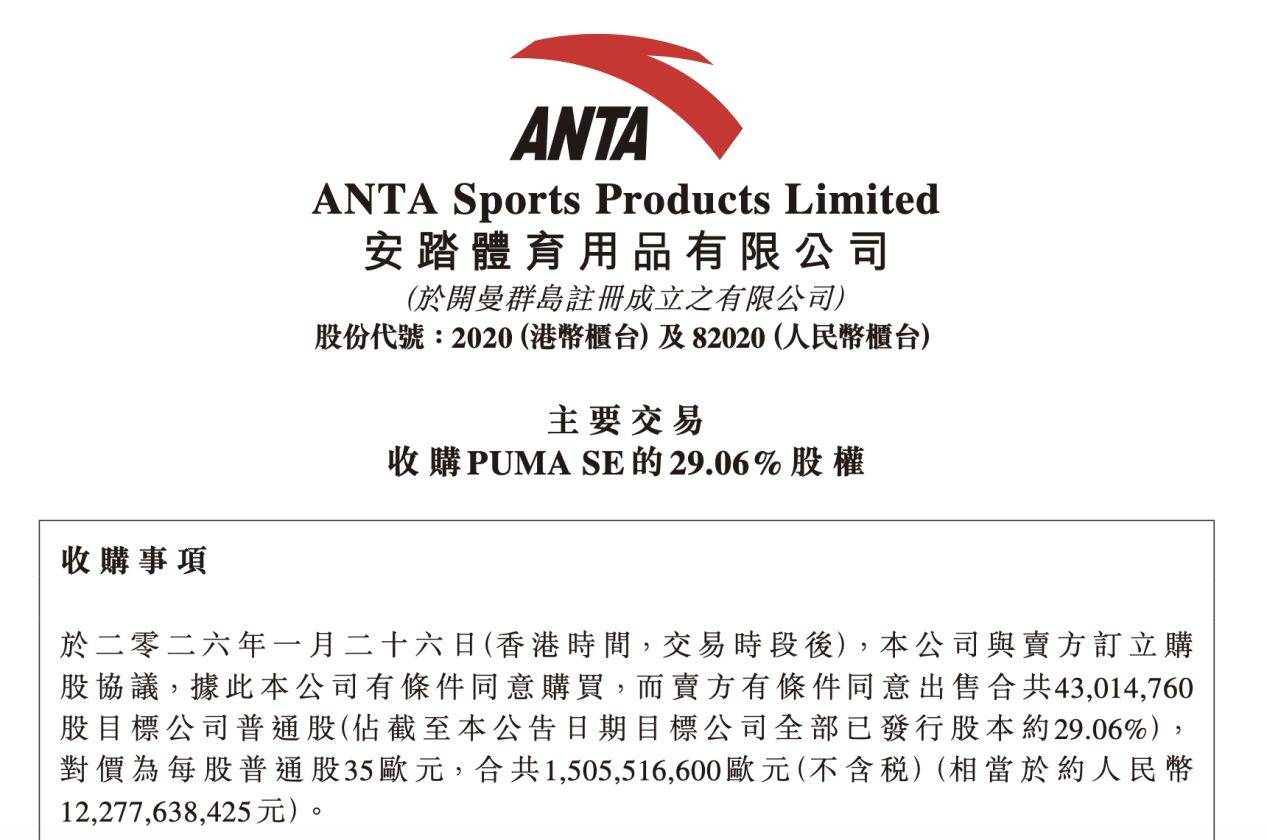 2026年1月27日,安踏体育用品有限公司(以下简称“安踏集团”)正式宣布,与法国皮诺(Pinault)家族旗下的投资公司Groupe Artémis达成购股协议,将以15亿欧元(约合124亿元人民币)的现金对价,收购全球知名运动品牌彪马(PUMA SE)约29.06%的股权。此次收购资金全部来源于安踏集团的内部自有现金储备。交易完成后,安踏集团将成为彪马公司的单一最大股东,但集团同时明确表示,目前没有对彪马发起全面要约收购的计划。这笔预计于2026年底前完成的交易,仍需获得相关监管部门的批准。