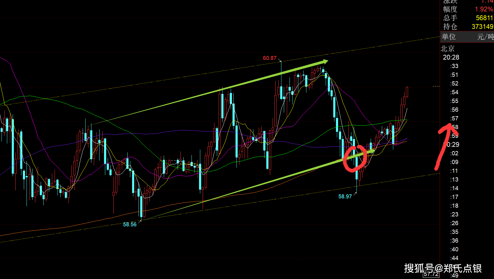 原油方面:上图所示,所以绿色通道下轨进行了假破位,今日再次稳定上行,那么围绕黄色通道来对待,下轨支撑59.2上仍看反弹为主,阻力目标61及上方;