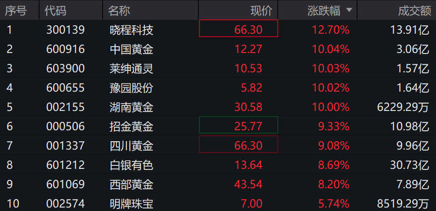 截至2026年1月28日 09:45,中证沪深港黄金产业股票指数(931238)强势上涨4.32%,成分股晓程科技涨超12%,中国黄金、莱绅通灵、豫园股份、湖南黄金均涨停。