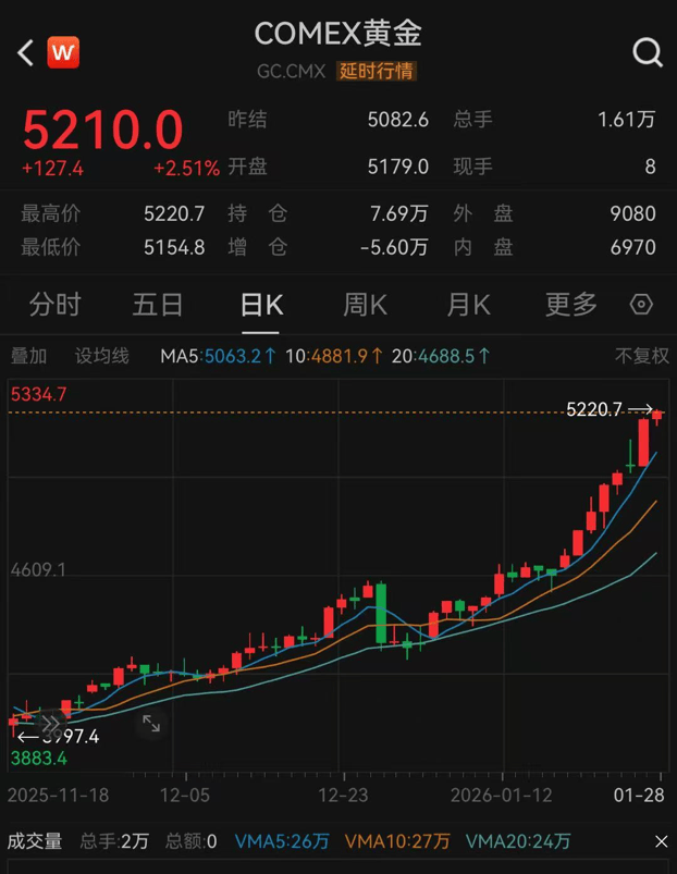 1月28日,国际金价持续暴涨,现货、期货双双突破美元/盎司关口,截至发稿,COMEX黄金报5210美元/盎司,上涨2.51%;伦敦金报5223.945美元/盎司,上涨0.81%。