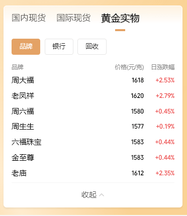老凤祥报价1620元/克,较前一日涨幅达2.79%;老庙报1612元/克,较前一日涨幅达2.35%。
