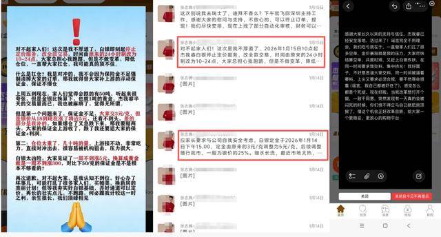 1月19日有用户发现提现困难,客服联系受阻,恐慌就此升级。张志腾透露平台面临挤兑现象,并呼吁大家理性沟通共度难关。“谣言完全不用理会,我们吃亏就在于,一直替家人们扛了很多空单,金价暴涨就是我的压力,大家尽快结算空单,共度时艰,又赶上白银作妖,在同一时间要求我交料,集中挤兑。”