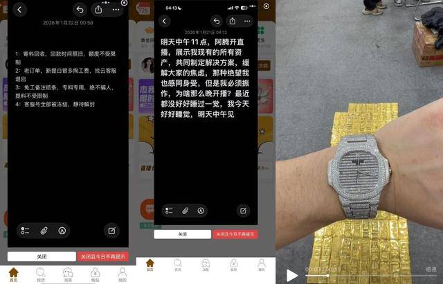 早在2025年12月开始,张志腾就多次在粉丝群和直播中显示财力以安抚用户,比如晒出他和满地实物金条、账户余额以及百达斐丽满天星的合照。与此同时,平台的免工活动、寄料回收业务照旧展开。