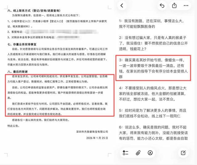挤兑风波爆发至今已有一周多,期间杰我睿方面多次强调“不会跑路”、“积极处理”、“若无挤兑公司本可顺利兑付”。1月27日晚间,其在公告中承认平台出现亏损,并承诺将对本金受损者有序分配剩余资金。