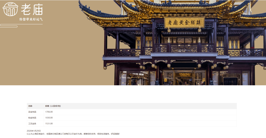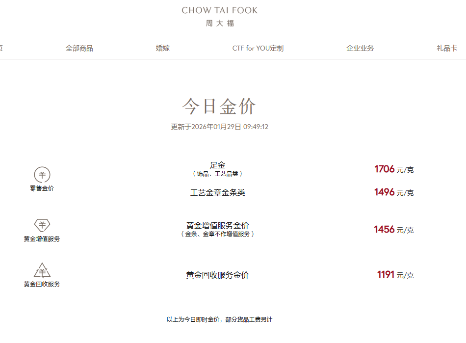周大福报价1706元/克,上涨88元/克;老庙黄金报价1722元/克,上涨104元/克;周生生报价1708元/克,上涨94元/克;老凤祥为1713元/克,上涨93元/克。
