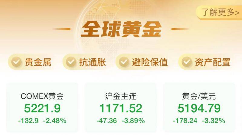 1月30日,国际金价格再度大跳水,现货黄金一度大跌近5%,截至北京青年报记者发稿,跌幅收窄至3.32%,报5194.79美元/盎司,失守5200美元关口。