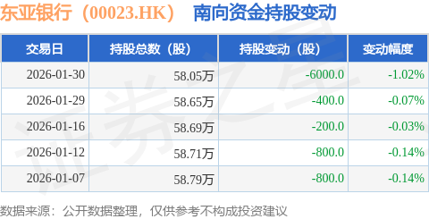 证券之星消息,1月30日南向资金减持6000.0股东亚银行(00023.HK)。近5个交易日中,获南向资金减持的有5天,累计净减持8200.0股。近20个交易日中,获南向资金减持的有20天,累计净减持8.24万股。截至目前,南向资金持有东亚银行(00023.HK)58.05万股,占公司已发行普通股的0.01%。