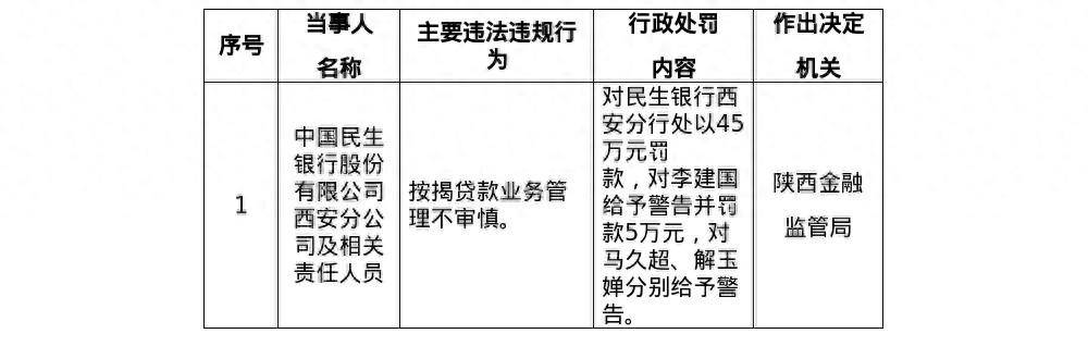 针对这一行为,陕西金融监管局对民生银行西安分行处以45万元罚款;对李建国给予警告并罚款5万元,对马久超、解玉婵分别给予警告。