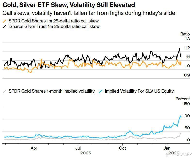 值得注意的是,期权交易员并未完全撤离市场。GLD与iShares白银ETF(SLV.US)的一个月隐含波动率仍维持在高位,显示市场对未来价格剧烈波动的预期依旧强烈。