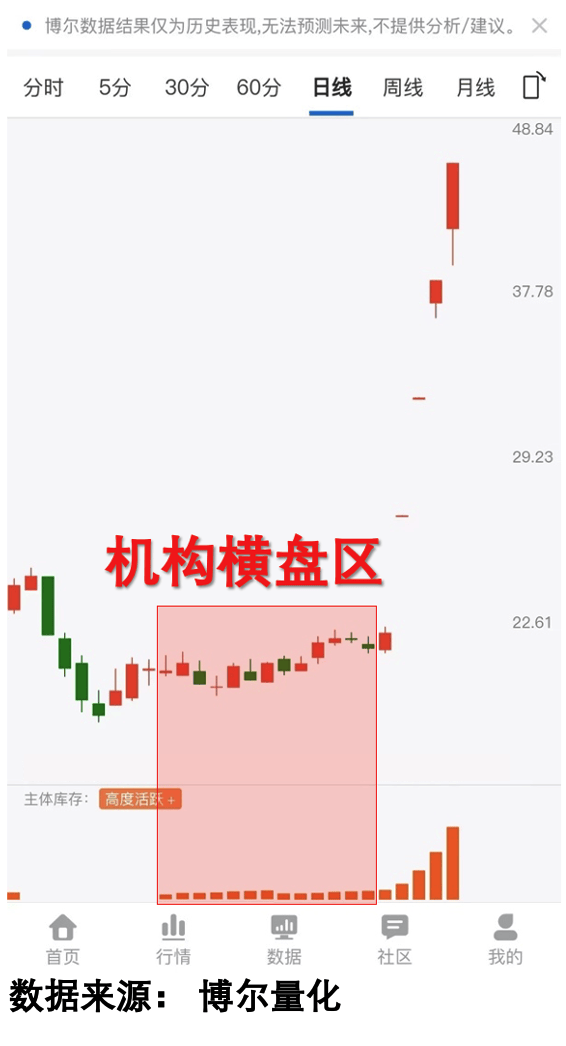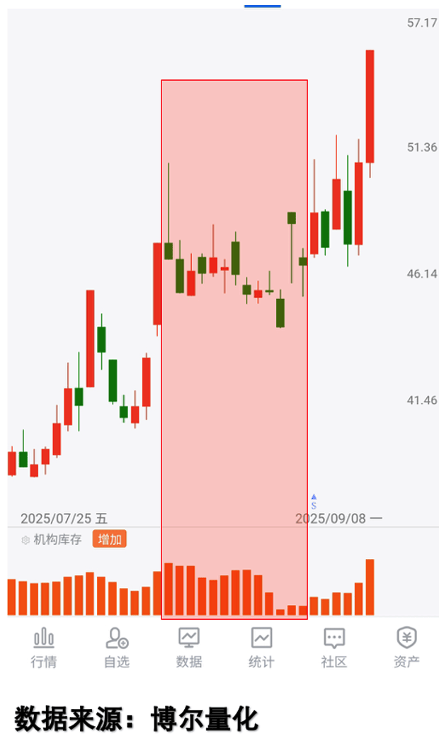 同样是经历四连阴后横盘的标的,最终走势却截然不同。某标的横盘阶段「机构库存」数据持续活跃,客观反映机构大资金在积极参与交易,后续股价实现上涨,这一结果直接验证了机构行为的核心作用,看图2: