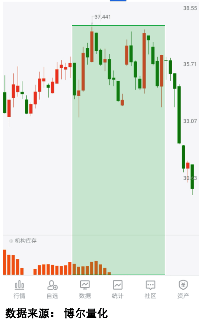 反之,部分标的在宽幅震荡过程中,多次出现大阳线拉升,从走势来看看似强势企稳,但量化数据却呈现出不同的客观特征。该标的震荡阶段「机构库存」数据逐渐消失,说明机构大资金参与意愿持续减弱,即便有大阳线出现,也不具备持续支撑的逻辑,最终股价出现大幅下跌,看图3: