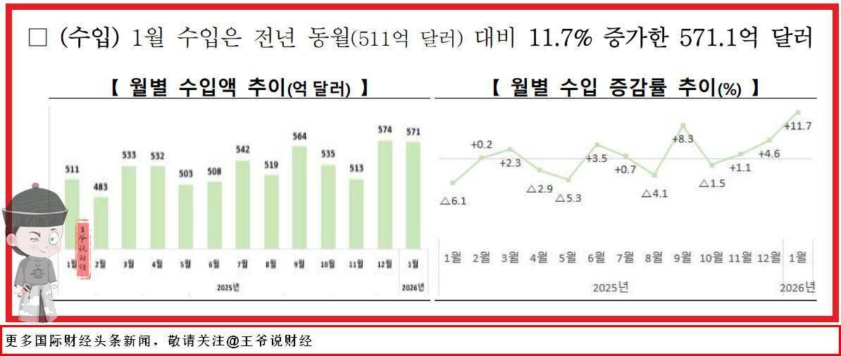 王爷说财经注意到,据韩国 产业通商部最新数据显示,1 月,韩国进口571亿美元,同比 增加11.7%,如下图: