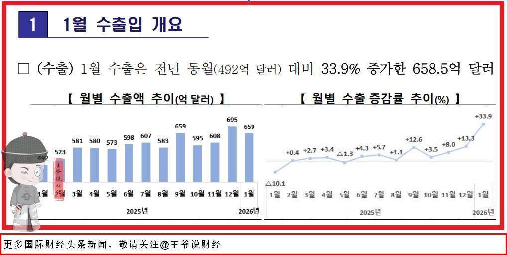 2月1日,据韩国 产业通商部最新公布的外贸数据显示,2026年 1月,韩国出口大涨近34%(33.9%),出口额突破658.5亿美元,创下历史同期最高纪录,如下图: