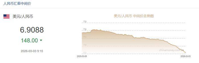 中新网3月3日电 据中国外汇交易中心网站消息,中国人民银行授权中国外汇交易中心公布,2026年3月3日银行间外汇市场人民币汇率中间价为:1美元对人民币6.9088元,上调148个基点。