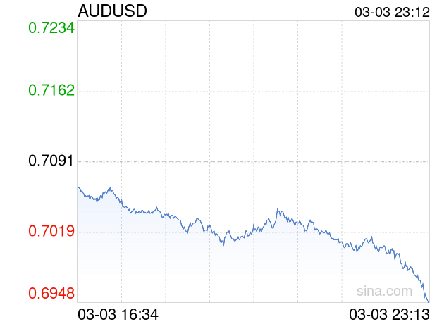 新浪外汇消息2026年03月03日,截至23时12分,外汇市场上澳元兑美元汇率跌破1澳元兑换0.6949美元。跌幅为-2.0025%