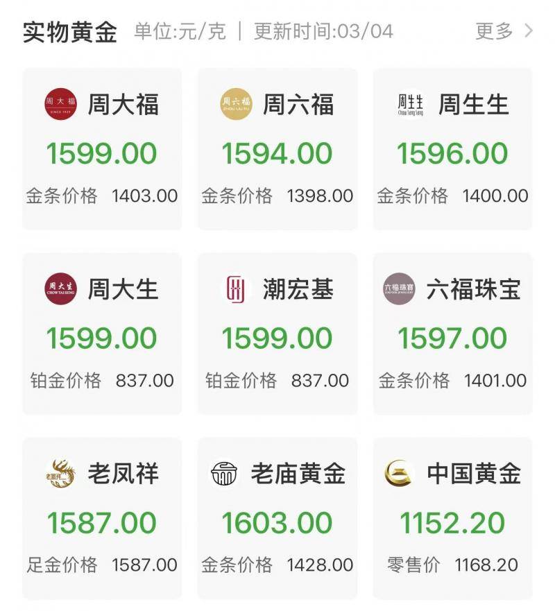 由于近期国际金价剧烈波动,4日早间,国内黄金饰品价格对比显示,多数金店金饰价格较昨日显著回调,多家报价已跌至1600元/克下方,较昨日下跌逾50元/克。