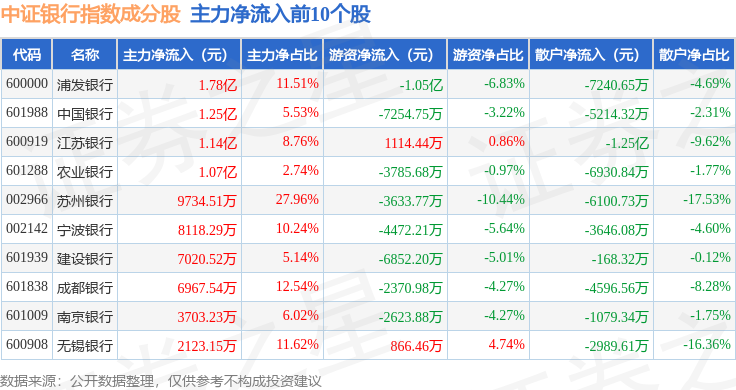 资金流向方面,中证银行(399986)指数成份股当日主力资金净流出合计2.94亿元,游资资金净流入合计2.0亿元,散户资金净流入合计9406.9万元。成份股资金流向详情见下表: