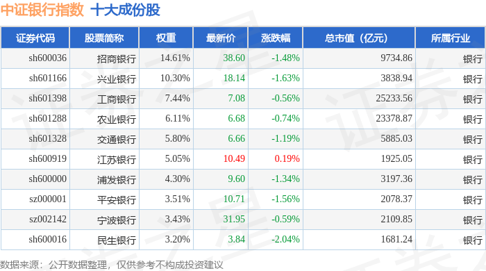 中证银行(399986)指数十大成份股详情如下: