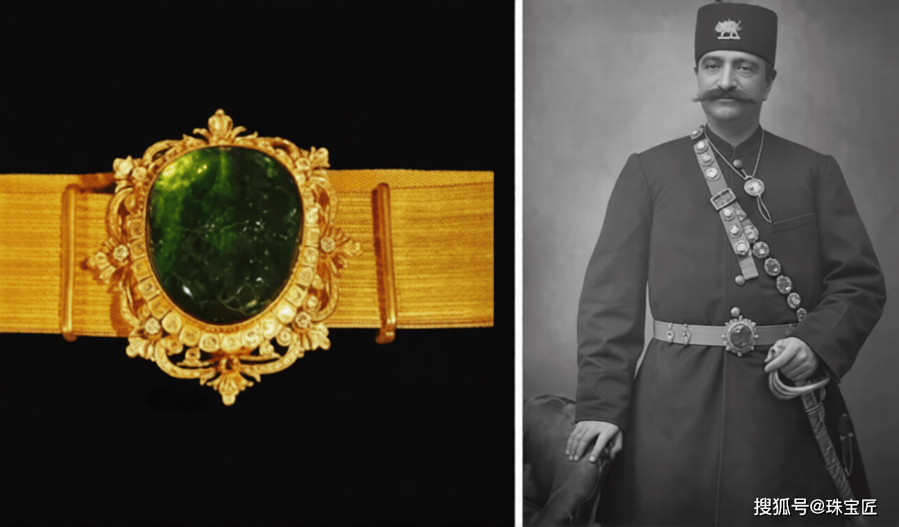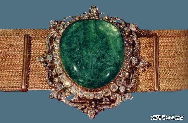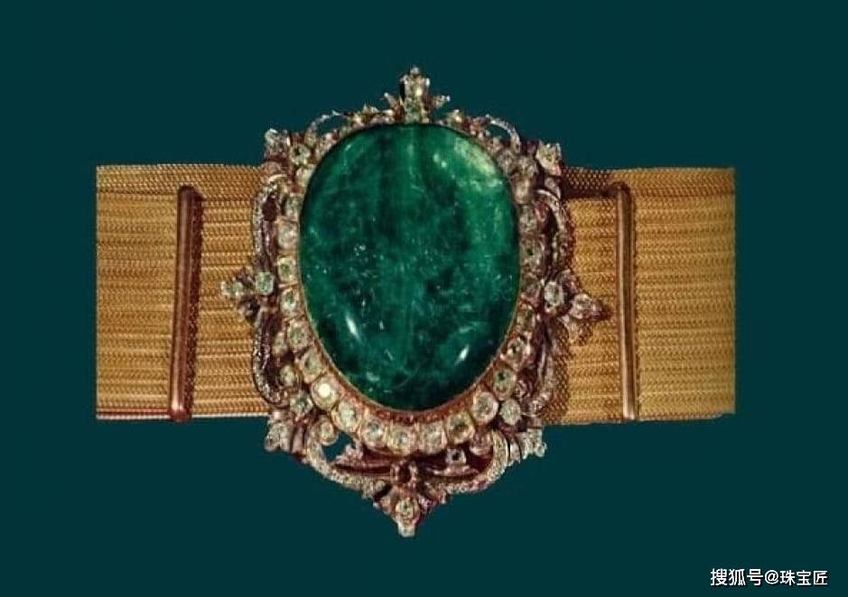 腰带制作于1850年左右,长119cm,以黄金为主要材质,正中央点缀的那颗重达176克拉的椭圆形祖母绿,最为引人注目。