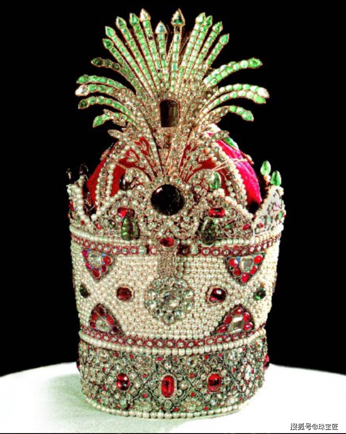 这顶王冠足足有4斤重,主体框架是由白金支撑,以绿色天鹅绒作为衬底,上面镶嵌有1469颗钻石、36颗祖母绿、34颗红宝石、2颗尖晶石以及105颗珍珠,其中,中间的祖母绿重达92克拉。妥妥的用宝石堆积起来的宝贝,款式相当的壕奢。