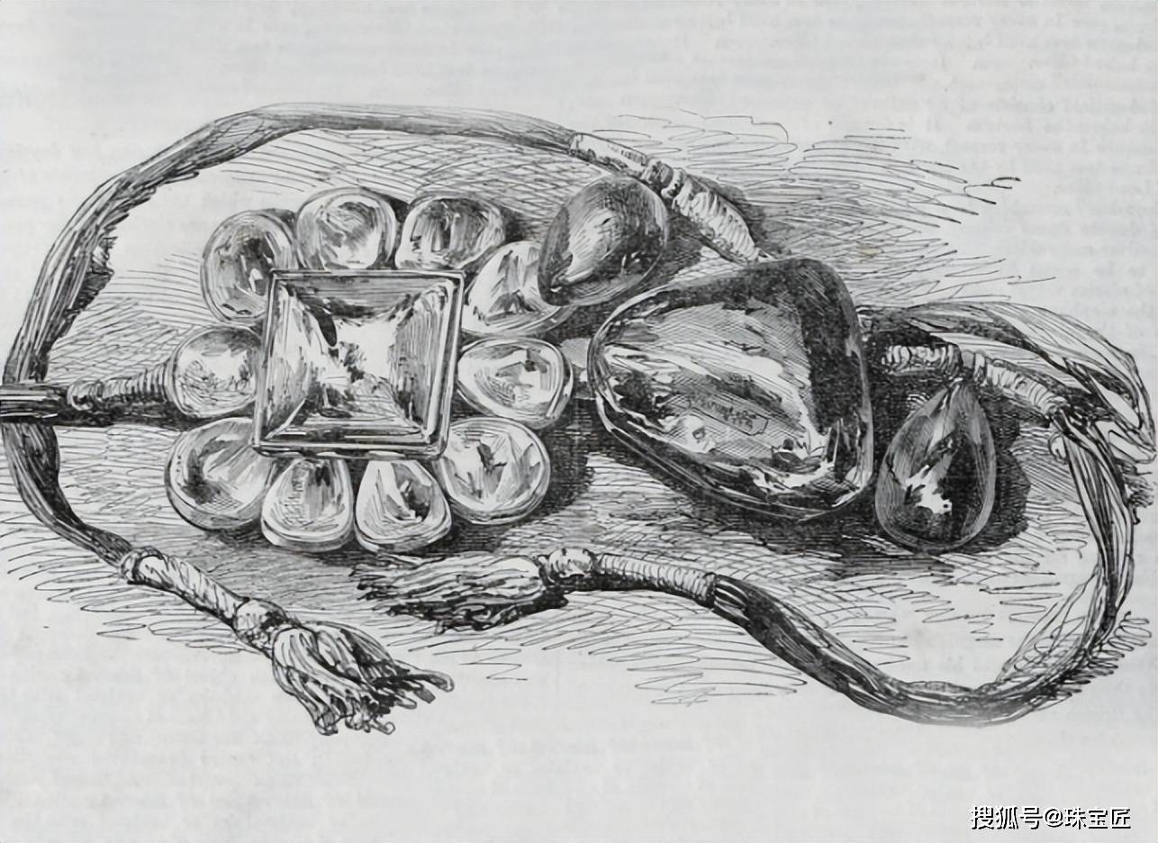这幅1851年关于大展的出版物中的插图,描绘了达里亚-伊-努尔钻石与其他波斯王室珠宝一同陈列的场景。
