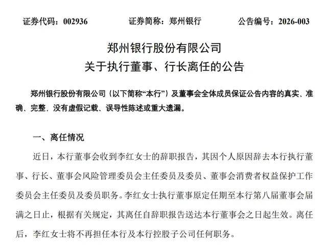 2026 年 2 月 12 日,郑州银行公告称,行长李红因 “个人原因” 辞职。