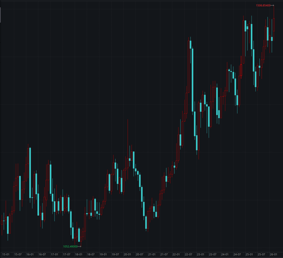 美元对韩元月K线走势图(2015年1月~2026年3月)