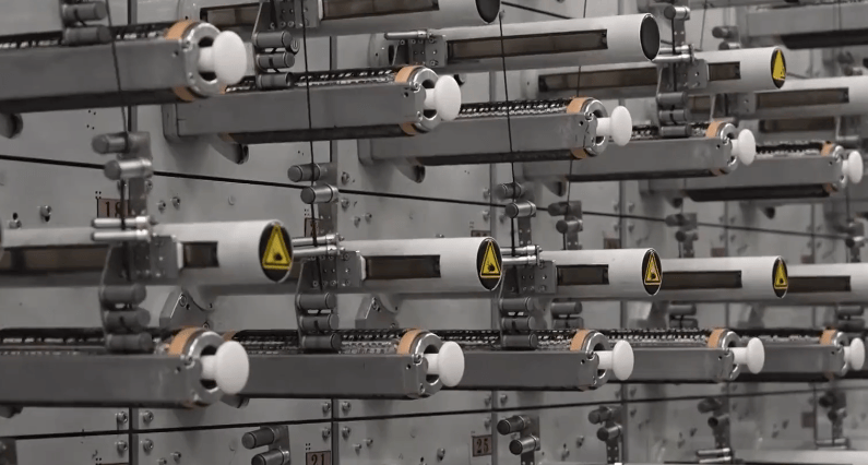 接下来就到了无氧碳化环节。低温炉里的温度是600~1000℃,原丝里的非碳物质在这里被基本去除;高温炉里的温度达1000~2000℃,在这里,材料真正完成碳化,成为碳纤维。