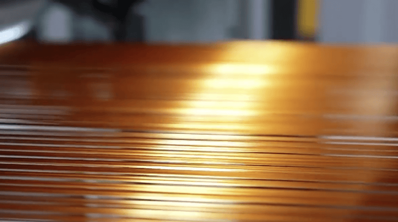 在十几层的S型往返卷轴上,最先进入氧化炉的原丝从白色开始变得金黄,随着进出氧化炉的次数越来越多,原丝由下往上,颜色变得越来越深。从金黄到深黄,再到棕色,最后变成黑色。