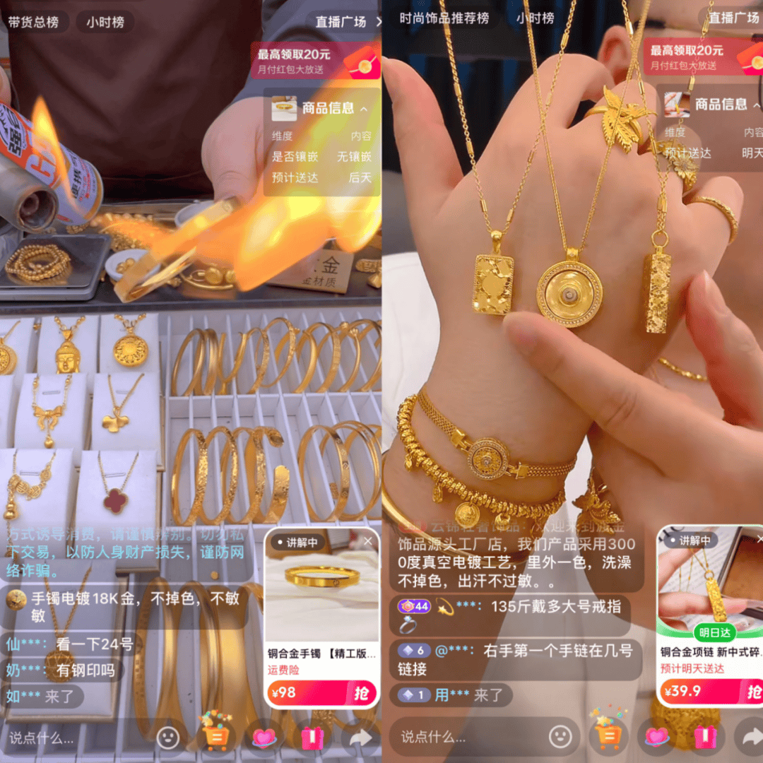 而金包银赛道,因为金层厚度无明确行业规范,部分商家存在金层厚度虚标行为,有些饰品佩戴不久便出现金层脱落的情况,更有商家刻意模糊“非纯金”的产品属性,变相误导消费者。