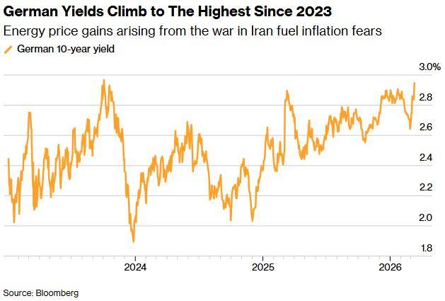 智通财经APP注意到,德国国债价格连续第二天下跌,由于市场担忧伊朗战争将进一步推升通胀,政府借贷成本被推高至 2023 年 10 月以来的最高水平。