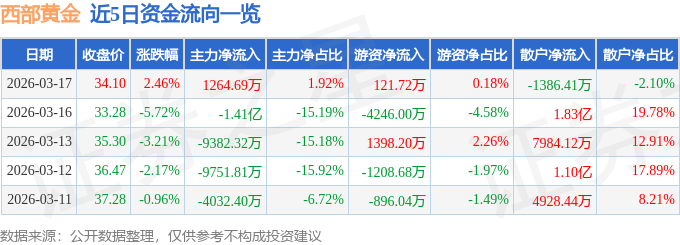 证券之星消息,截至2026年3月17日收盘,西部黄金(601069)报收于34.1元,上涨2.46%,换手率2.2%,成交量19.51万手,成交额6.59亿元。