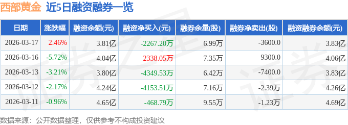 西部黄金融资融券信息显示,融资方面,当日融资买入3052.0万元,融资偿还5319.2万元,融资净偿还2267.2万元。融券方面,融券卖出900.0股,融券偿还4500.0股,融券余量6.99万股,融券余额238.36万元。融资融券余额3.83亿元。