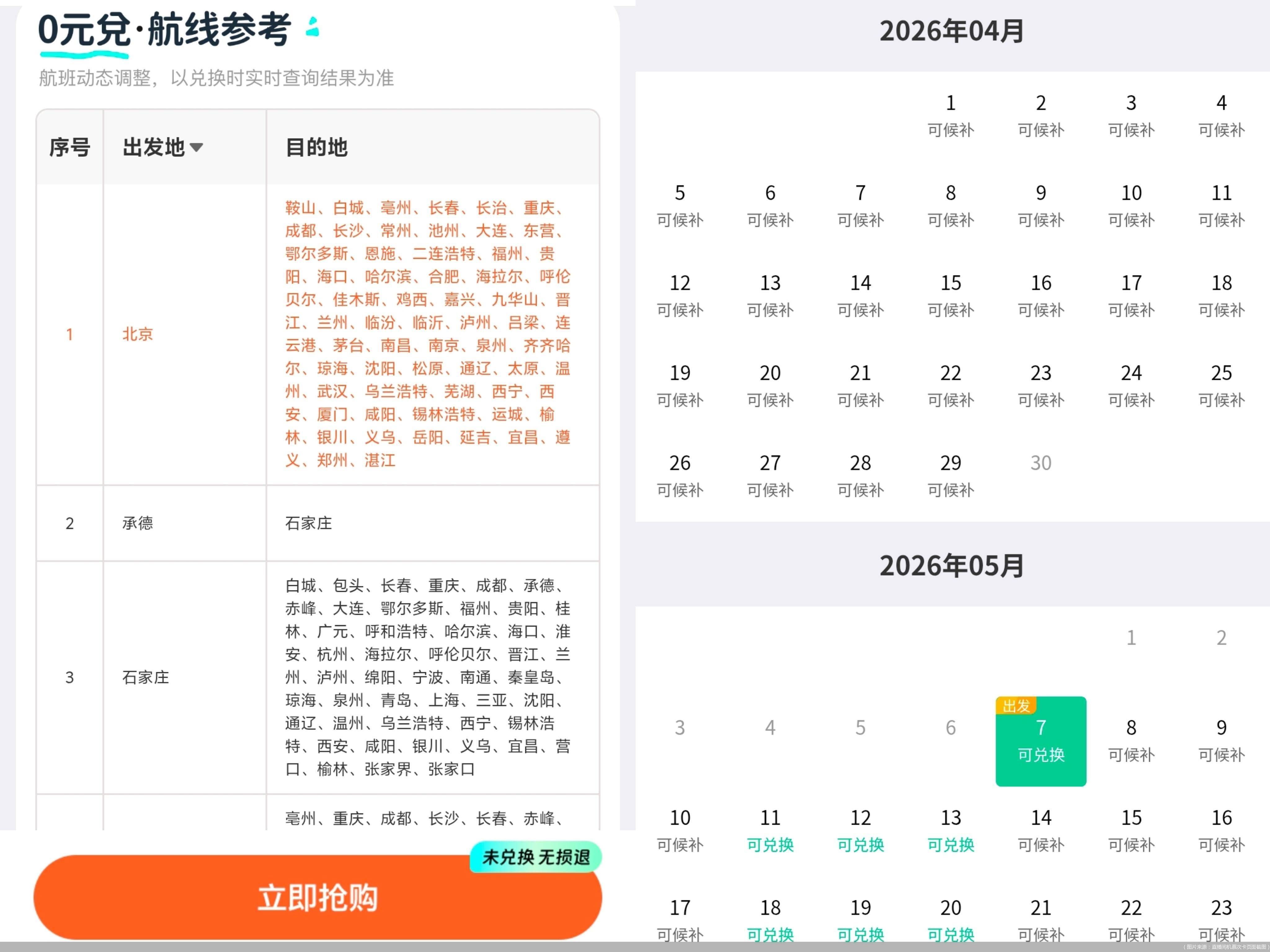 其中,在一家民营航司的官方直播间,未下单时点击链接,即可跳转到航班查询页面,查看可预约的航班日期;但部分航司及旅游平台的直播间只在链接中标注了可兑换的航线范围,具体可预约的航班日期无法查询。不过,这些直播间均在产品中注明“航班动态调整,以兑换实时查询结果为准”。