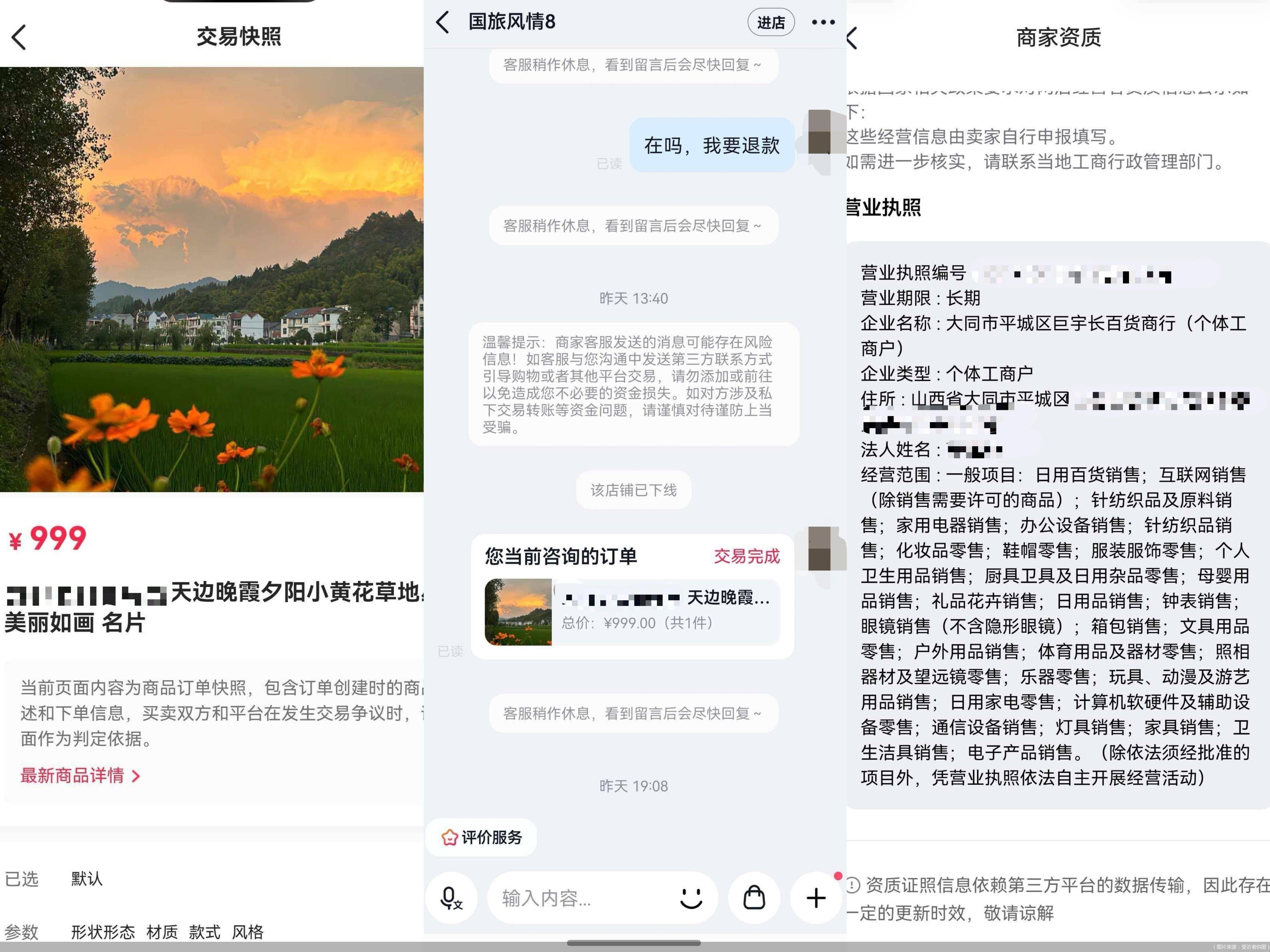 但事实上,商家假借寄出实体卡自动终结了订单交易,将预付式服务消费异化为一锤子买卖的实物交易。2026年1月,王茜申请退款时发现店铺已下线,也无法通过订单直接发起退款。打着“国旅”招牌的店铺实际上是不具备旅游经营资质的个体工商户,已注销失联。最终平台仅补偿360元消费券,与王茜近3000元损失相去甚远。