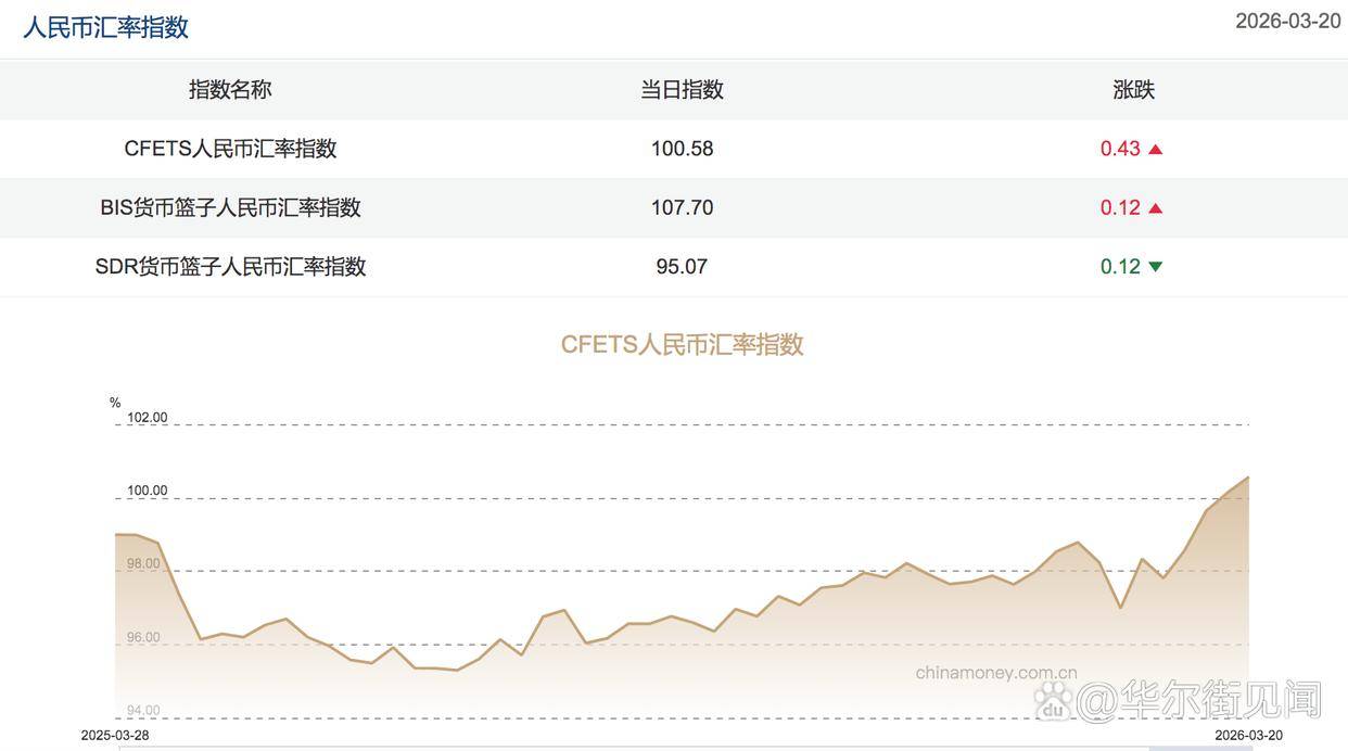 中国外汇交易中心(CFETS):3月20日人民币汇率指数按周涨0.43至100.58。