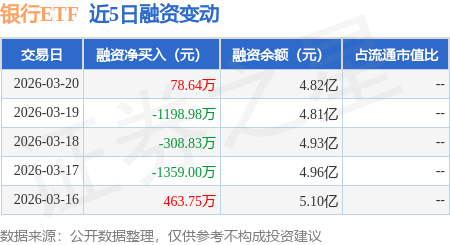 证券之星消息,3月20日,银行ETF(512800)融资买入1.02亿元,融资偿还1.01亿元,融资净买入78.64万元,融资余额4.82亿元。