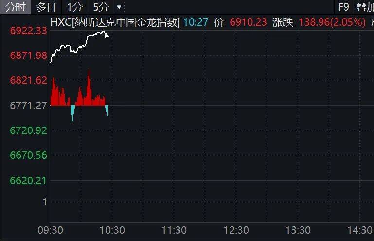 中概股普涨,纳斯达克中国金龙指数盘中拉升,截至发稿,涨超2%。宝尊电商涨16.43%,虎牙涨6.25%,京东涨超5%。