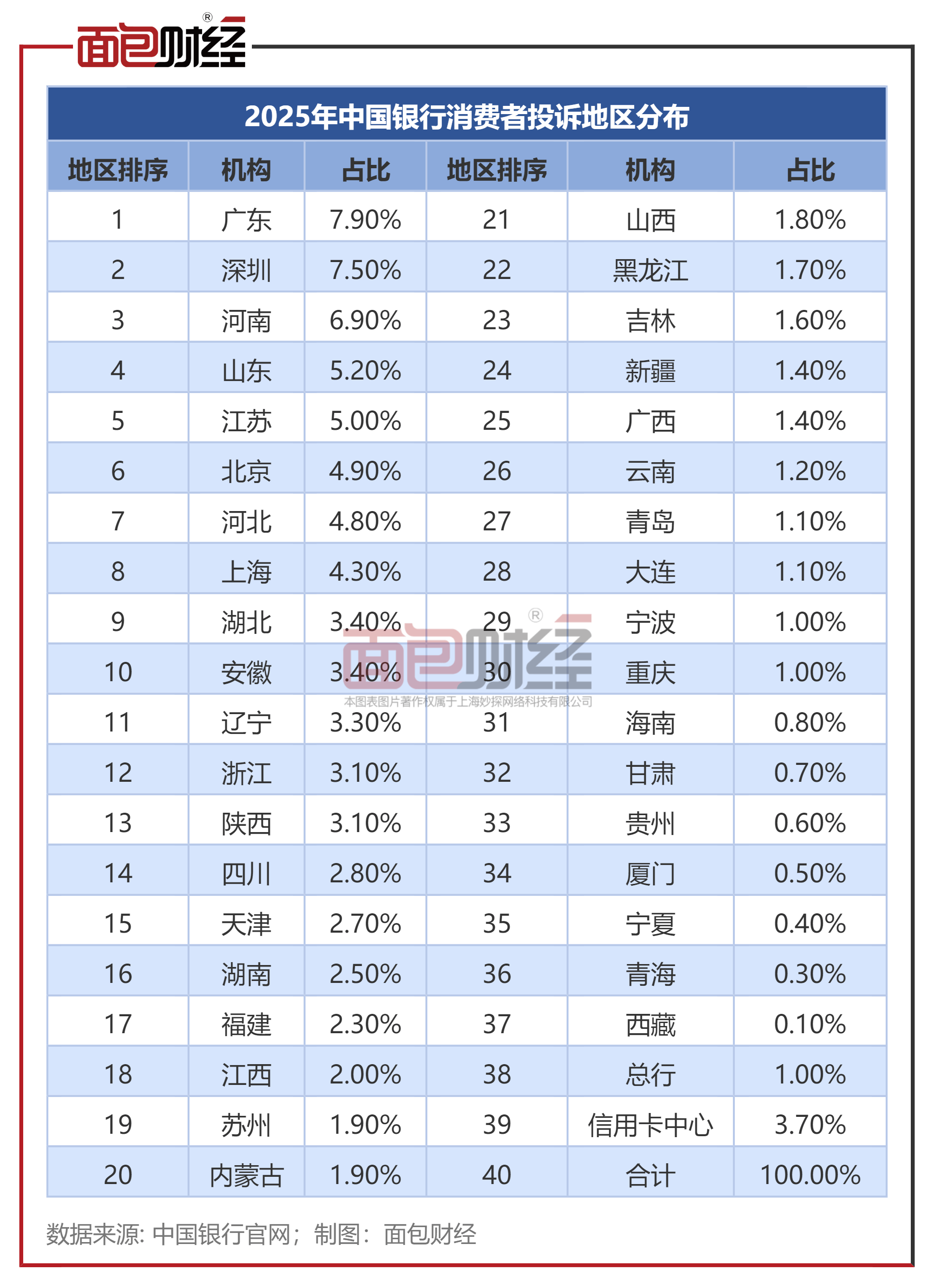 数据显示,2025年中国银行广东地区的投诉量占总投诉量的7.9%,深圳地区的投诉量为7.5%,投诉量占比居前二。河南、山东、江苏地区的消费者投诉量占比分别从2024年4.2%、3.4%、4.4%上升至2025年的6.9%、5.2%、5.0%,位列第三至第五位。