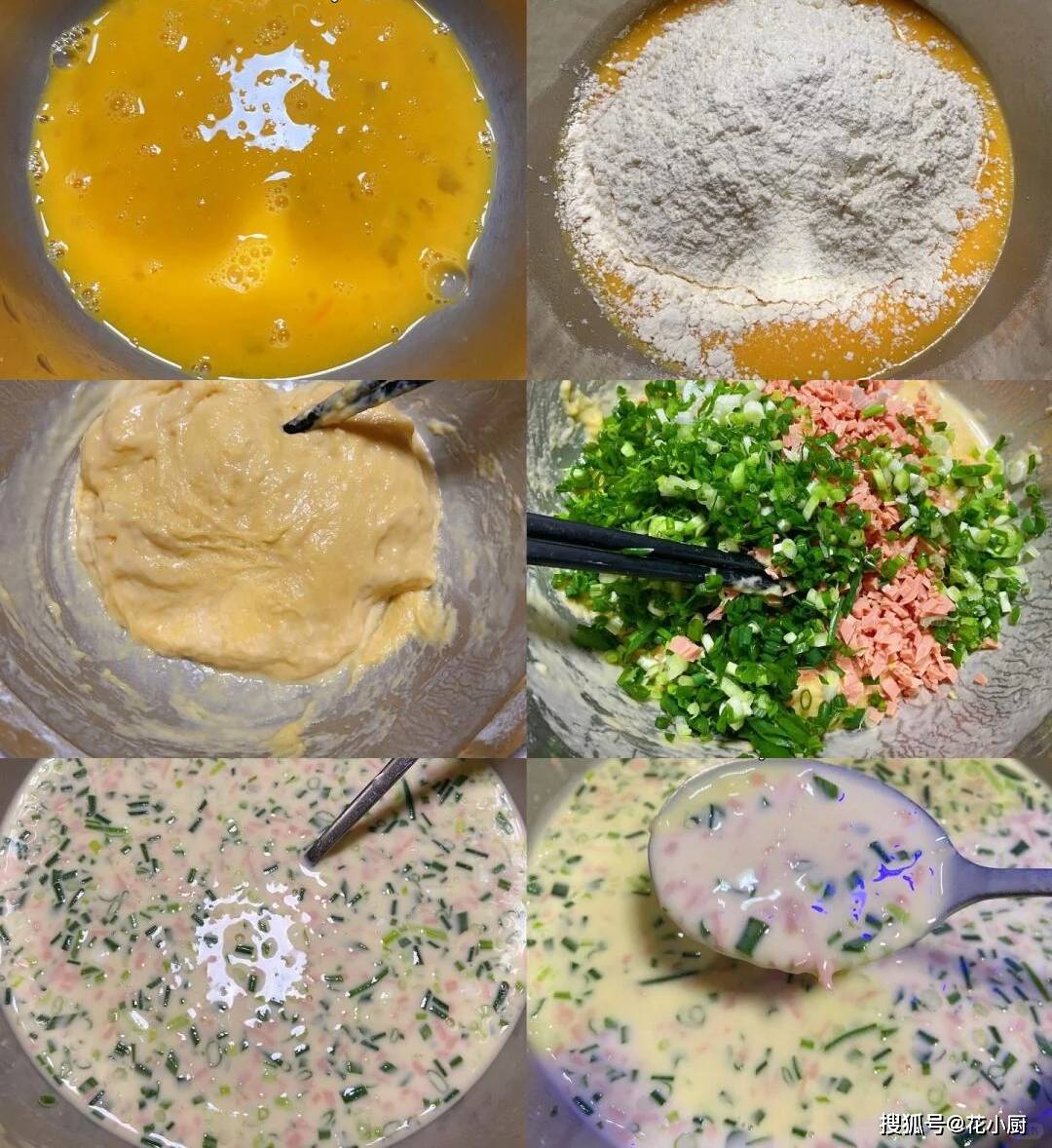 1️⃣四个鸡蛋,加上葱花、火腿丁、面粉、适量盐和清水,搅和成稀酸奶那样的面糊(水和面粉比例是 2:1)。