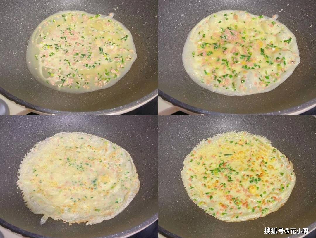 3️⃣蛋液凝固的时候,撒上芝麻、葱花煎熟即可。